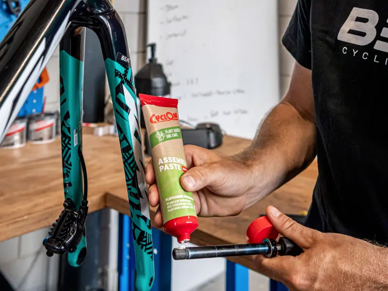 CyclOn Assembly Paste is an indispensable tool for mounting threaded parts on your bike. This high-quality plant-based ceramic assembly paste reduces friction between metal surfaces, preventing screw threads from seizing. In addition, CyclOn Assembly Paste provides a waterproof seal. This prevents moisture penetration and creaking and squeaking noises during bicycle use.